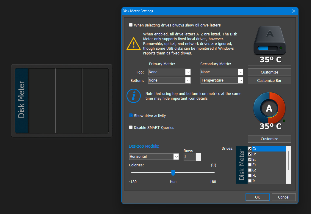 I would like to see an option to change the font for the data below the drive. I am using it on a 24" HD monitor and I have to make it larger than I would like to easily read the data. I also think showing data on the top and bottom would look too cluttered.